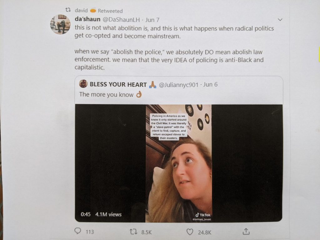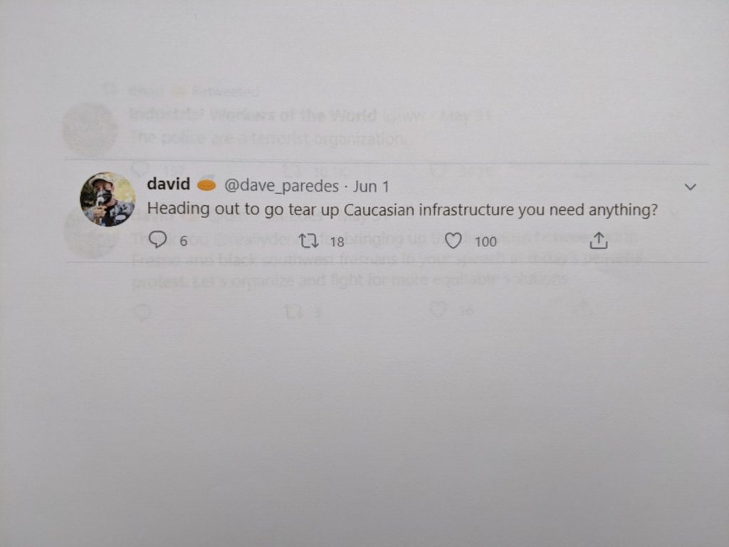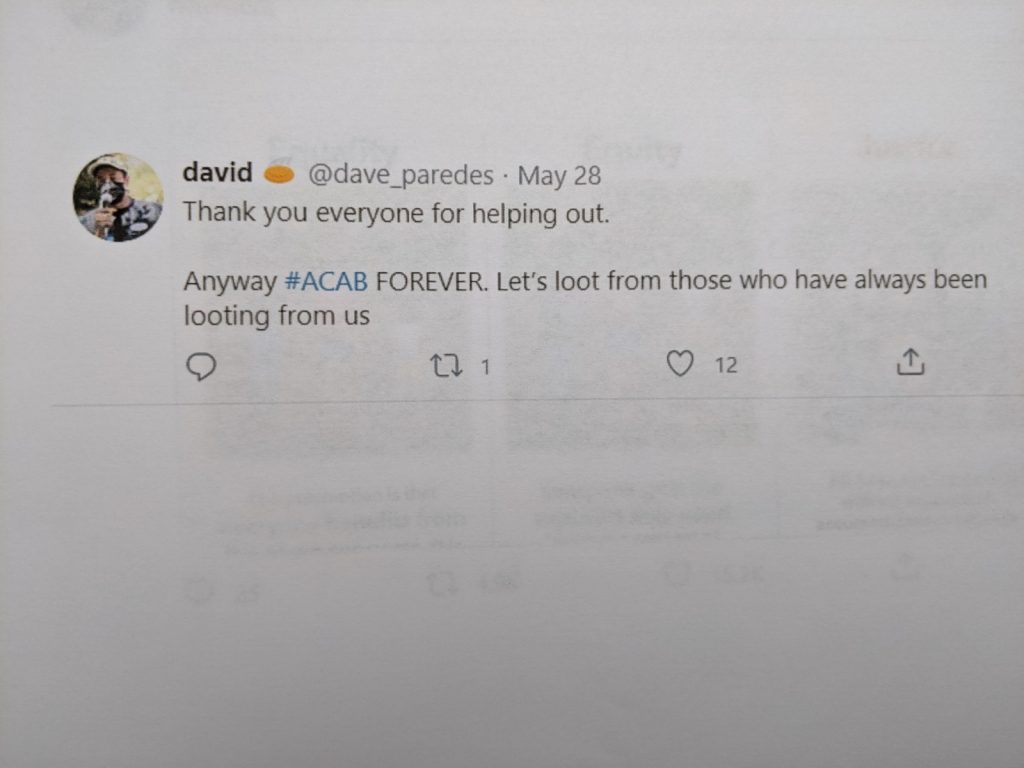Paredes’ personal Twitter account included a number of shared tweets featuring “abolish the police” advocacy and others, penned by himself, using a the anti-police refrain “ACAB,” otherwise known as “All Cops are Bastards.”