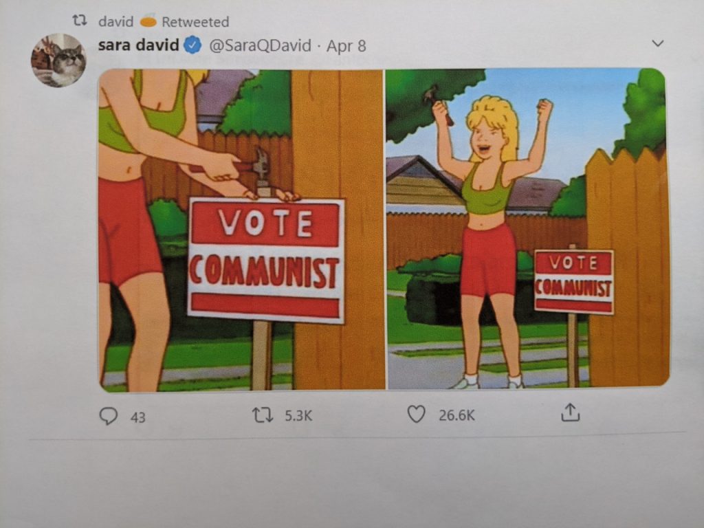 Another tweet, shared by a third-party but retweeted by Paredes, features imagery from the 2000s animated sitcom King of the Hill with a sign reading “Vote Communist.”